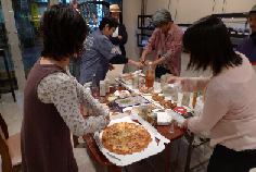 みなさん、どうもありがとうございました! 本日は関西チームの合流もあり、唯一と言っていいほど参加者が一同に会する日でもありますので、 例年通り、ちょっと早めの打ち上げが行われました。 ピザのデリバリーをあらかじめ予約し、商店街でお惣菜とビールを調達し、と準備は万全! さすがに三回目ともなるとそのあたりの段取りもスムーズです(笑)。